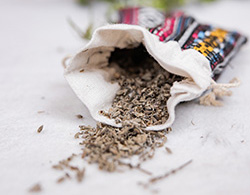 A beautiful cloth bag filled with lavender, lavender is another medicine that is used to promote calmness and relaxation.
